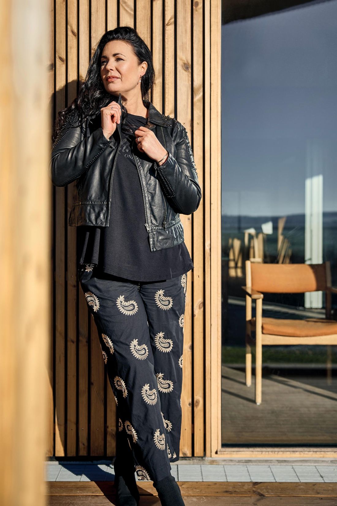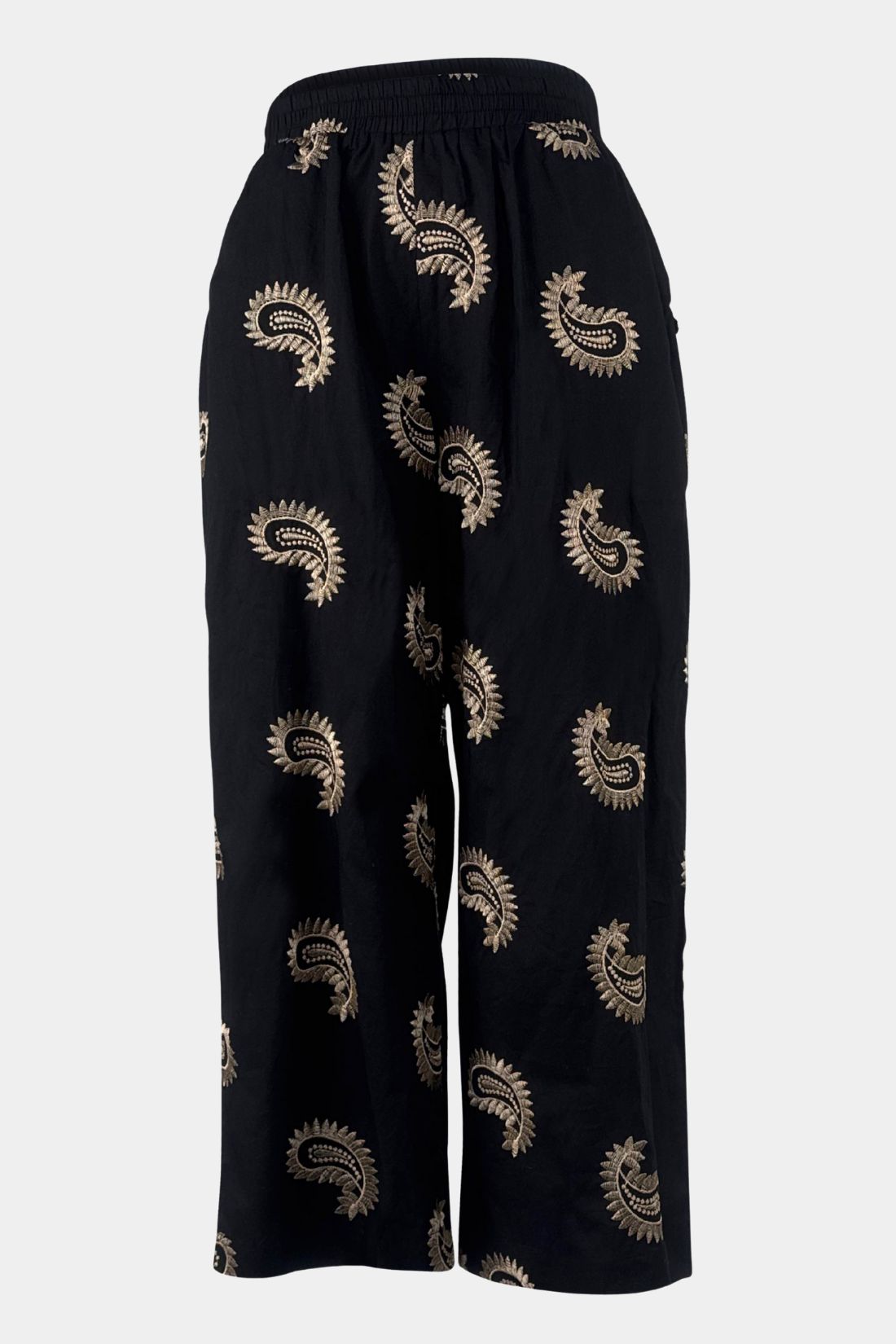 Smukke og unikke bomuldsbukser fra Zoey, designet i sort bomuld med elegant paisleybroderi i gyldne nuancer. Modellen har vidde i benene og elastik i taljen, som giver et komfortabelt og afslappet fit. Stoffet er uden stræk, men falder let og naturligt for et feminint og sofistikeret udtryk.