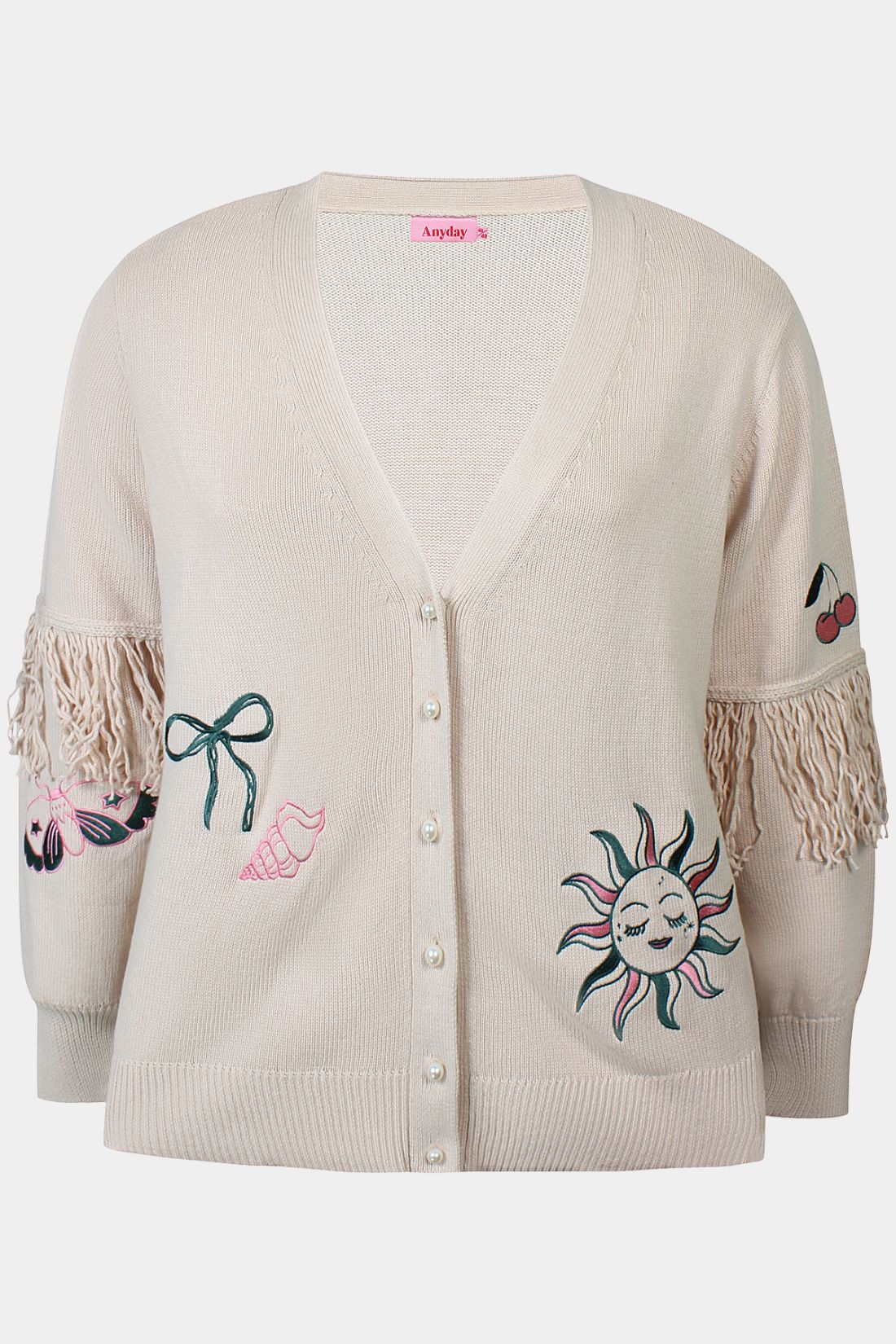 Bloom strikcardiganen fra Anyday er en smuk og feminin cardigan i ren bomuld, designet i en blød beige farve med fine dekorative detaljer. Modellen har V-hals, gennemgående knaplukning og lange ærmer. De små broderier og frynser på ærmerne giver cardiganen et unikt, håndlavet udtryk og tilfører et elegant boheme-touch.