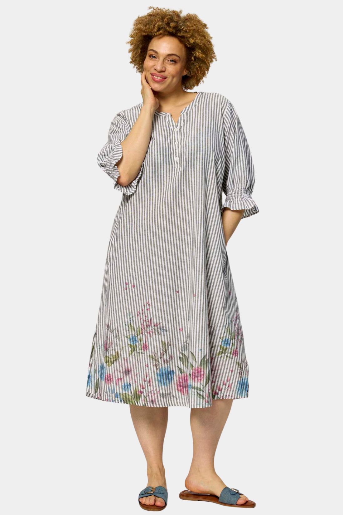 Let og feminin kjole fra Zhenzi i en blød viskosekvalitet. De fine striber kombineret med det blomstrede print forneden giver et frisk og sommerligt udtryk, mens den løse pasform sikrer høj komfort.