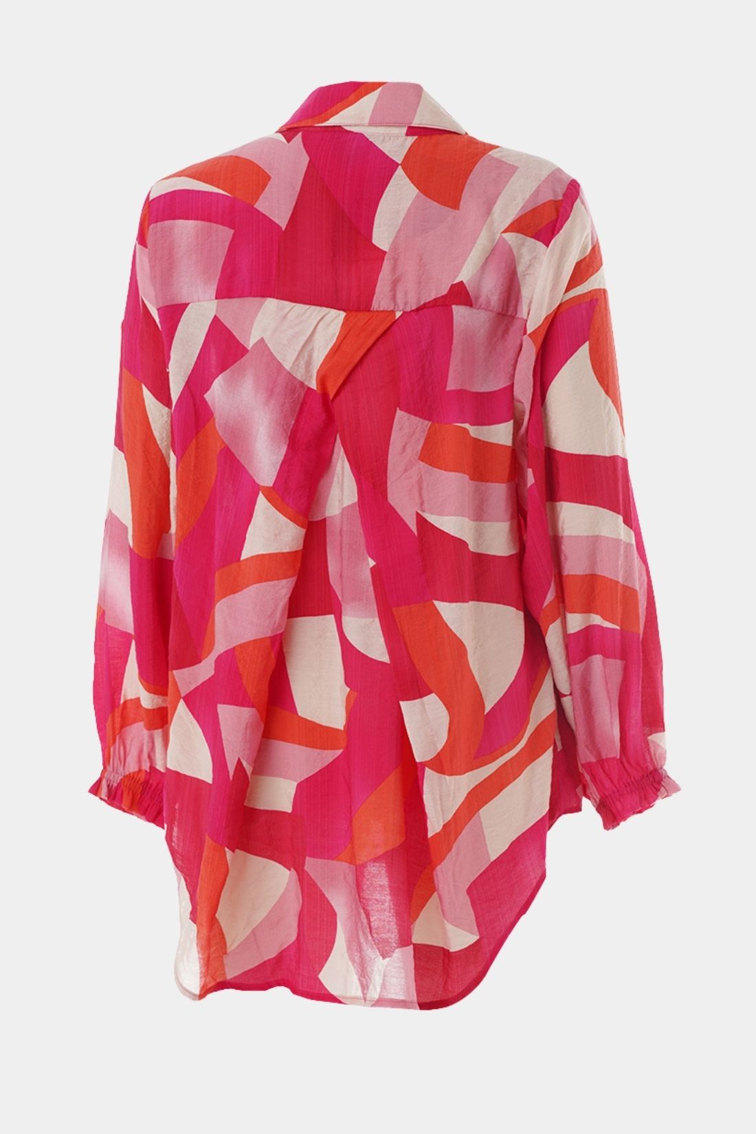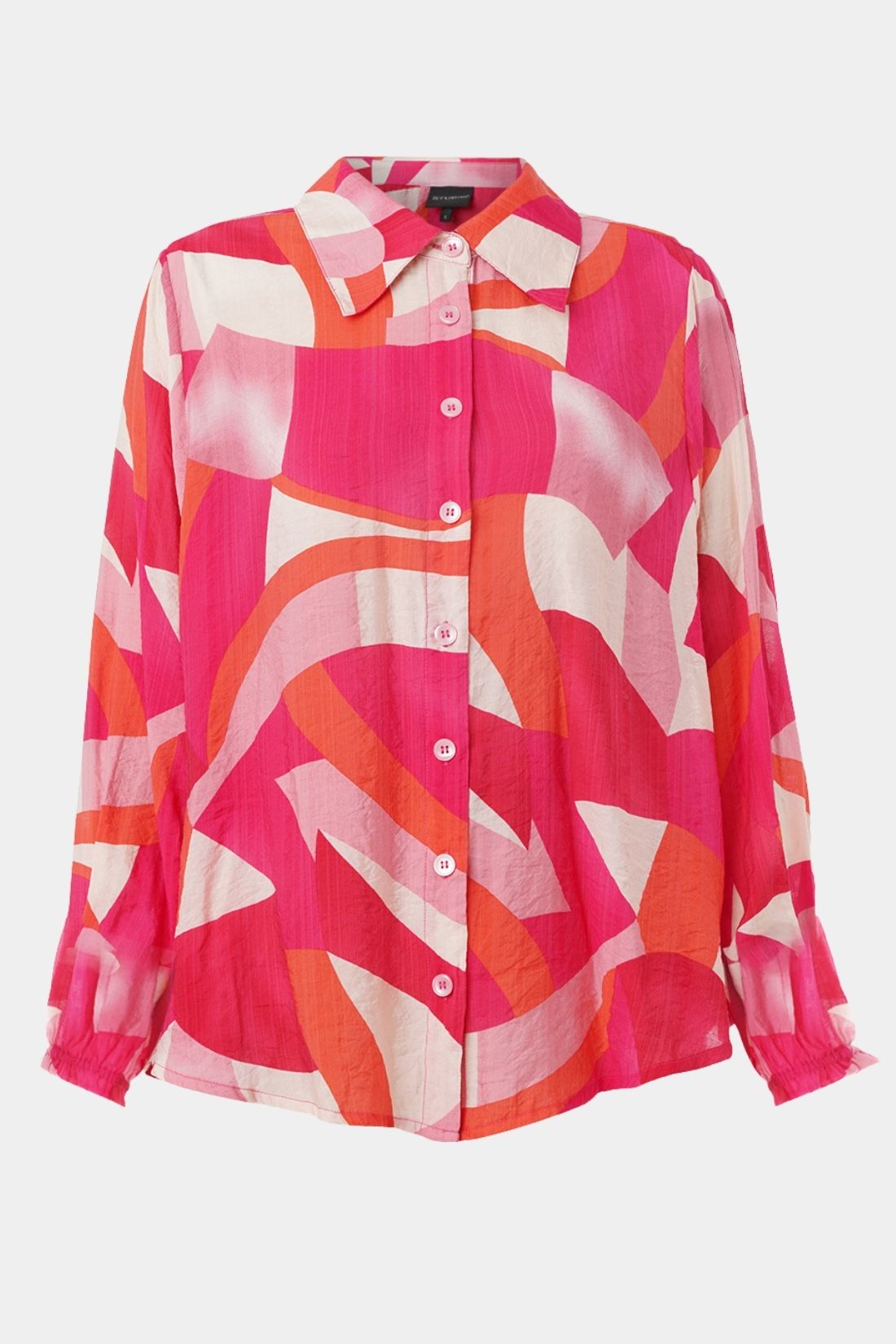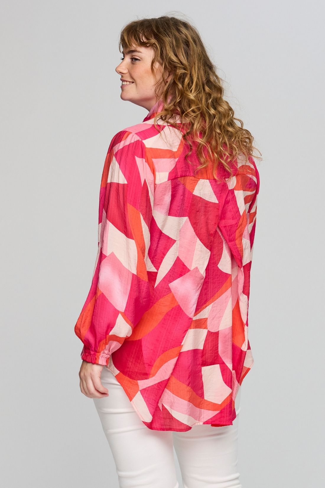 Skjorte fra Studio i et smukt og iøjnefaldende print i pink og orange nuancer, der giver et moderne og feminint udtryk. Den lette kvalitet og løse pasform gør den behagelig at have på hele dagen.