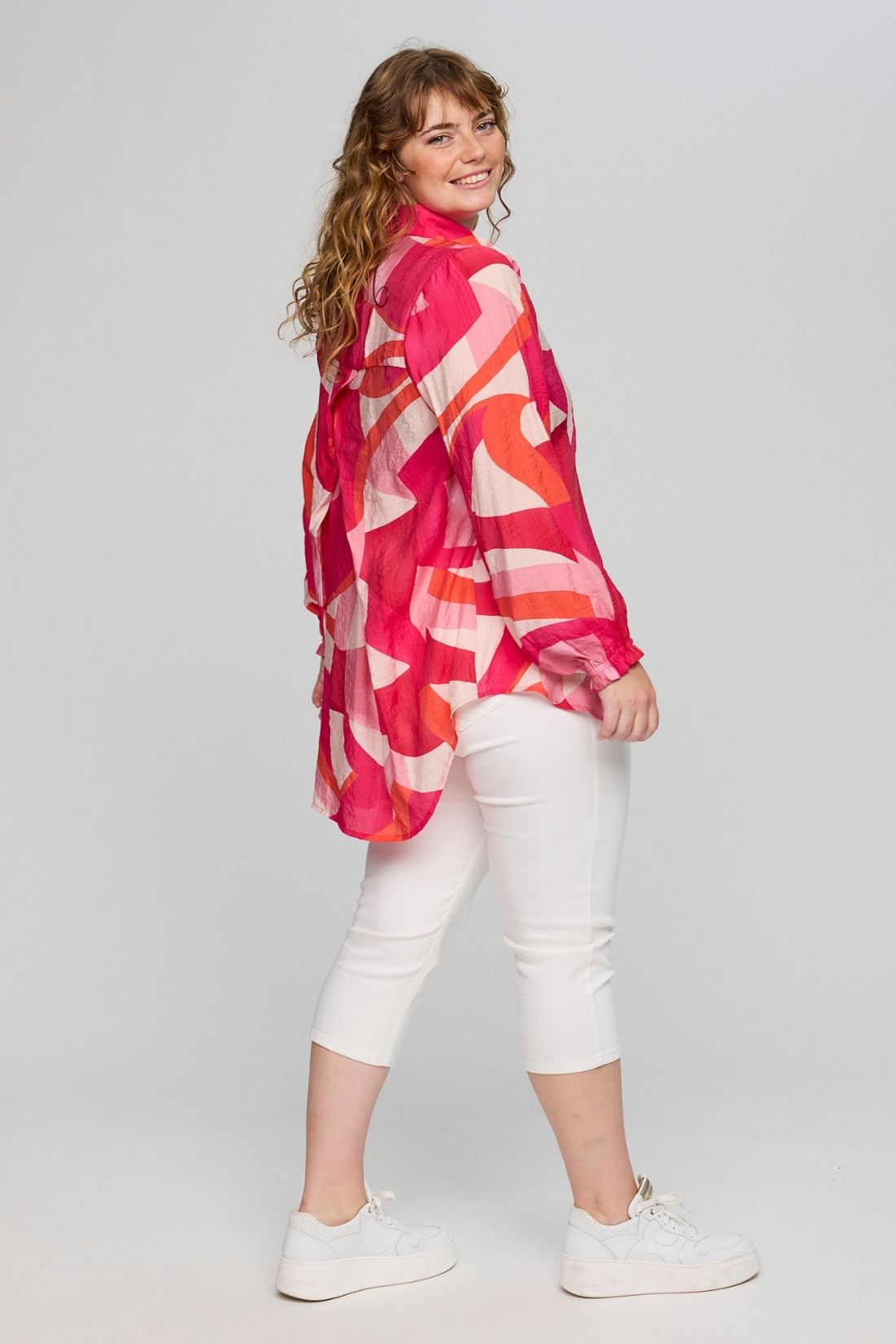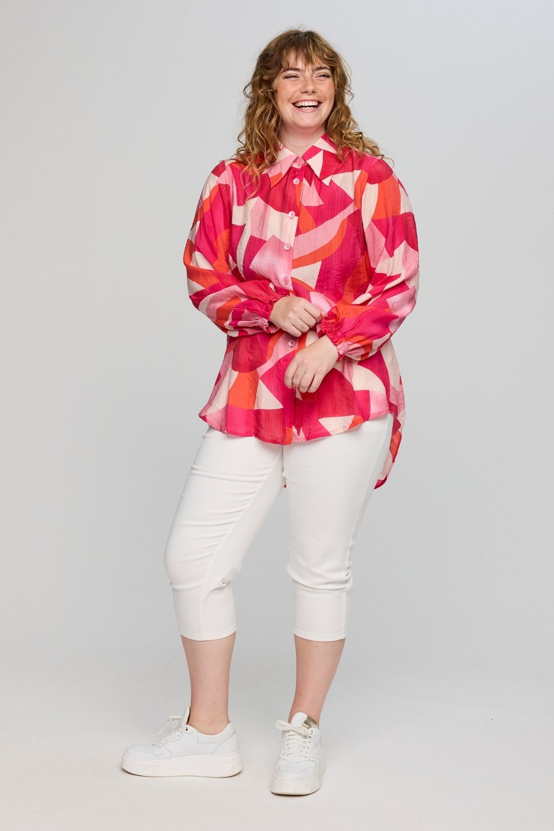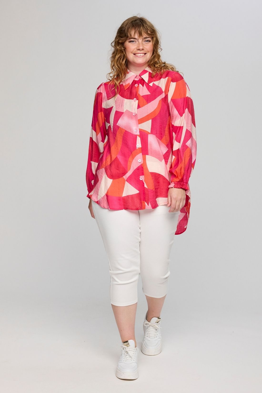Skjorte fra Studio i et smukt og iøjnefaldende print i pink og orange nuancer, der giver et moderne og feminint udtryk. Den lette kvalitet og løse pasform gør den behagelig at have på hele dagen.