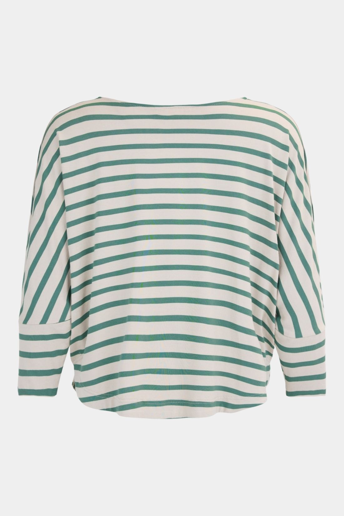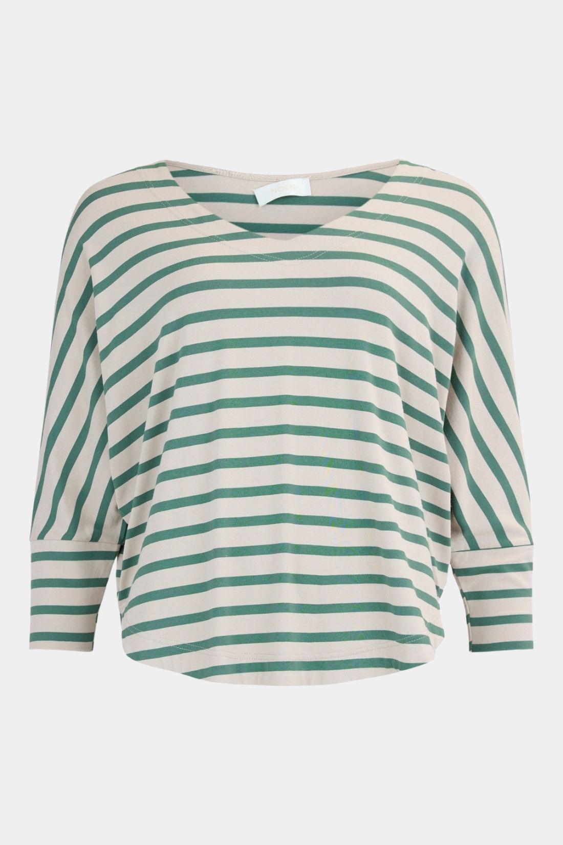 En bluse fra Noen syet i en høj kvalitets viskosejersey med et let og behageligt udtryk. Den lyse sandfarve kombineret med grønne striber giver et roligt og anvendeligt look til hverdagen. V faconen er mere rummelig over brystet og smallere ved hoften hvilket giver et flot og komfortabelt fald.