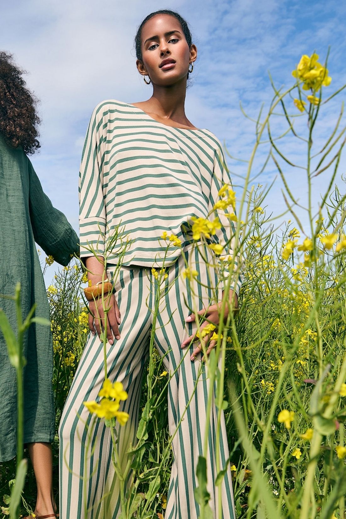 • Stribet design i sand og grøn