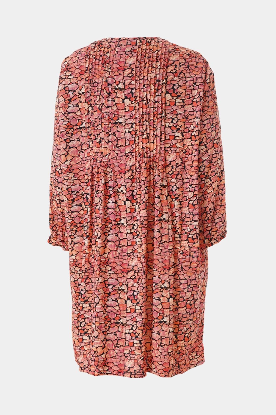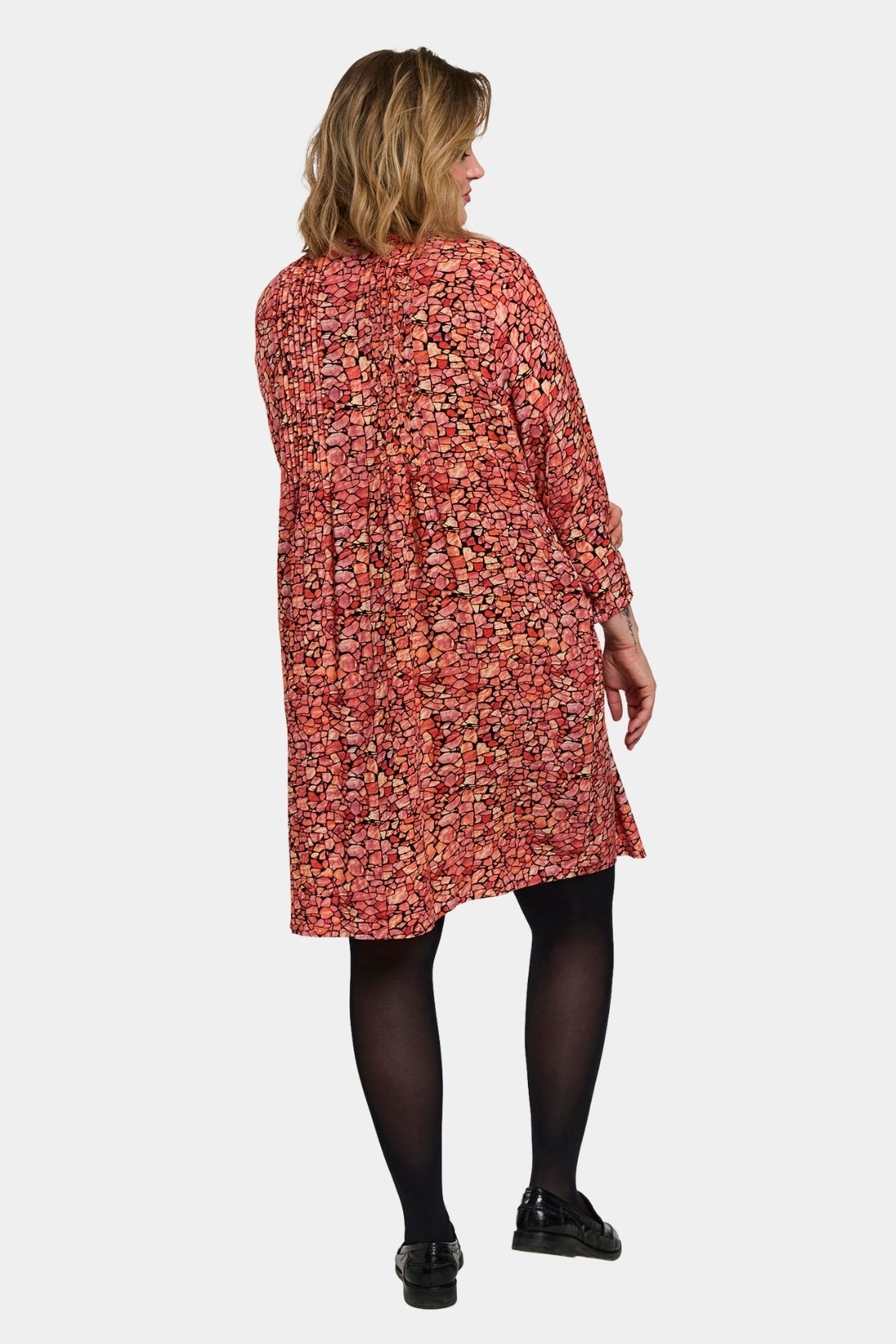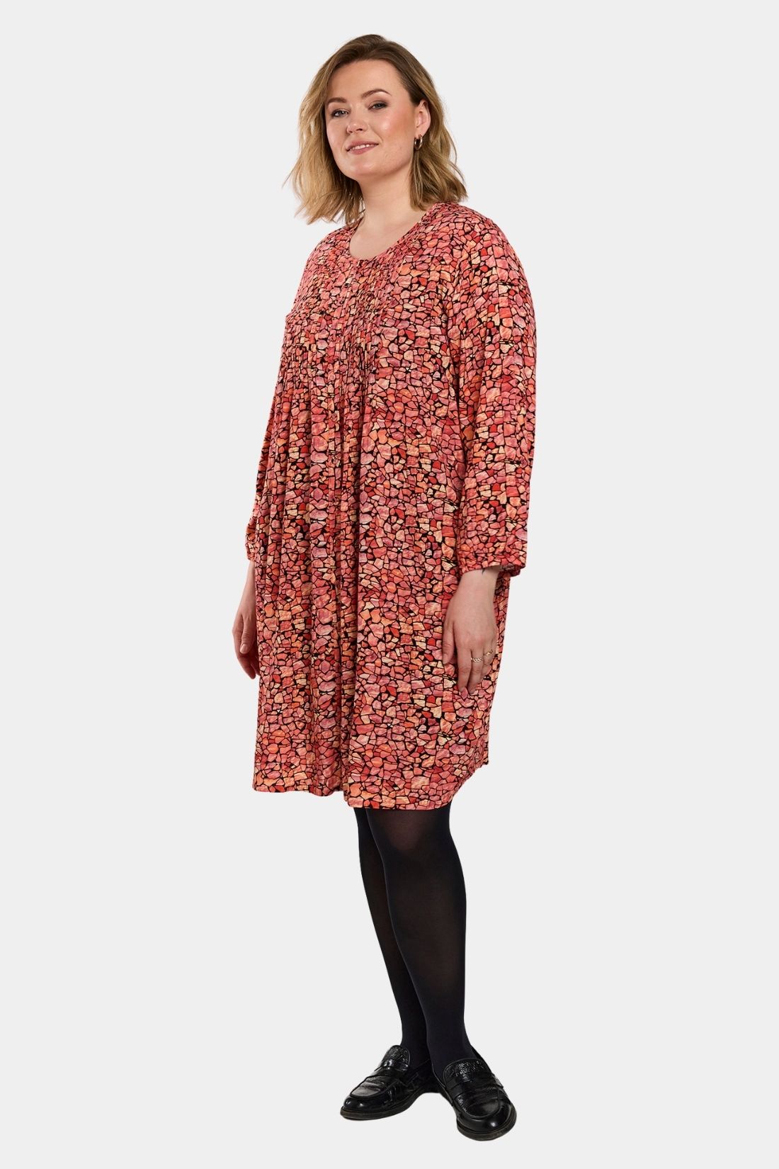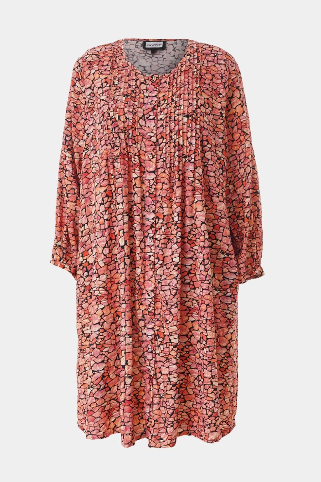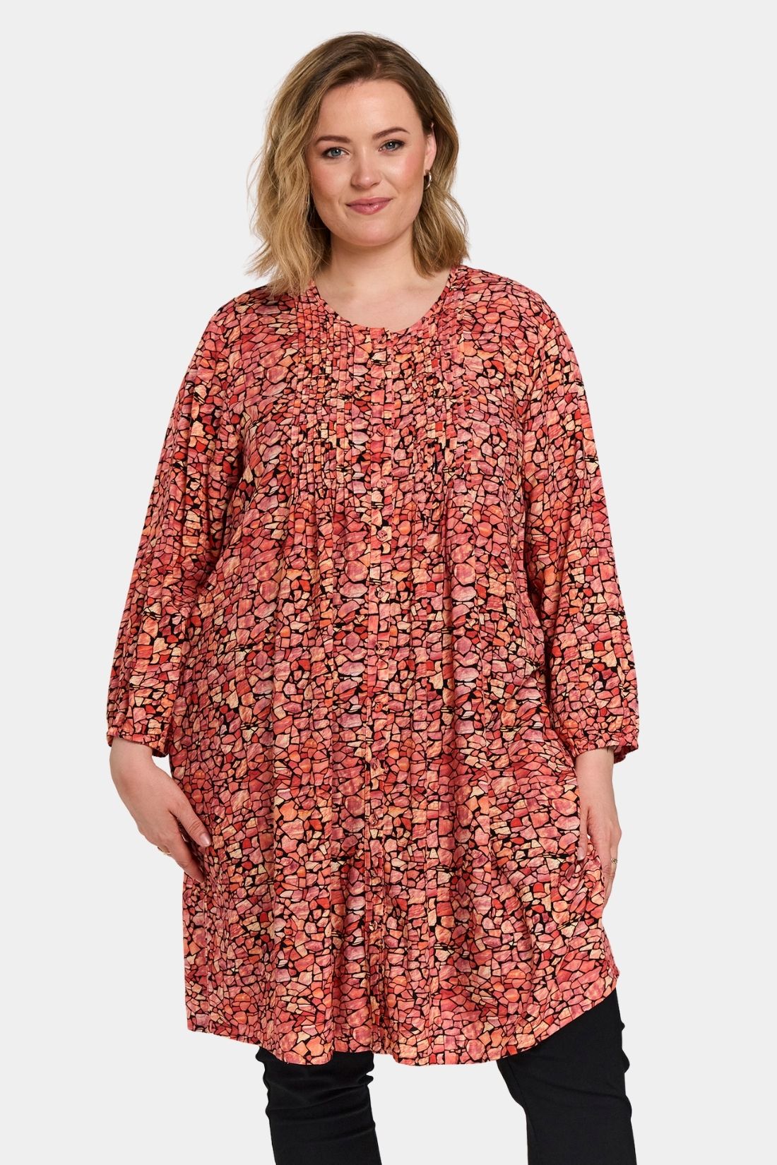 Johanne er en af Gozzips mest populære tunikaer – en let og feminin skjorte-tunika i en blød viskoseblanding med smukt rød grafisk print. Modellen har rund hals med gennemgående knaplukning samt 3/4-ærmer med elastisk afslutning, som giver et afslappet og let udtryk. De mange læg over brystet og i ryggen skaber smuk volumen og et behageligt fald, mens den lige, løse pasform og afrundede kant gør tunikaen ekstra flatterende.
