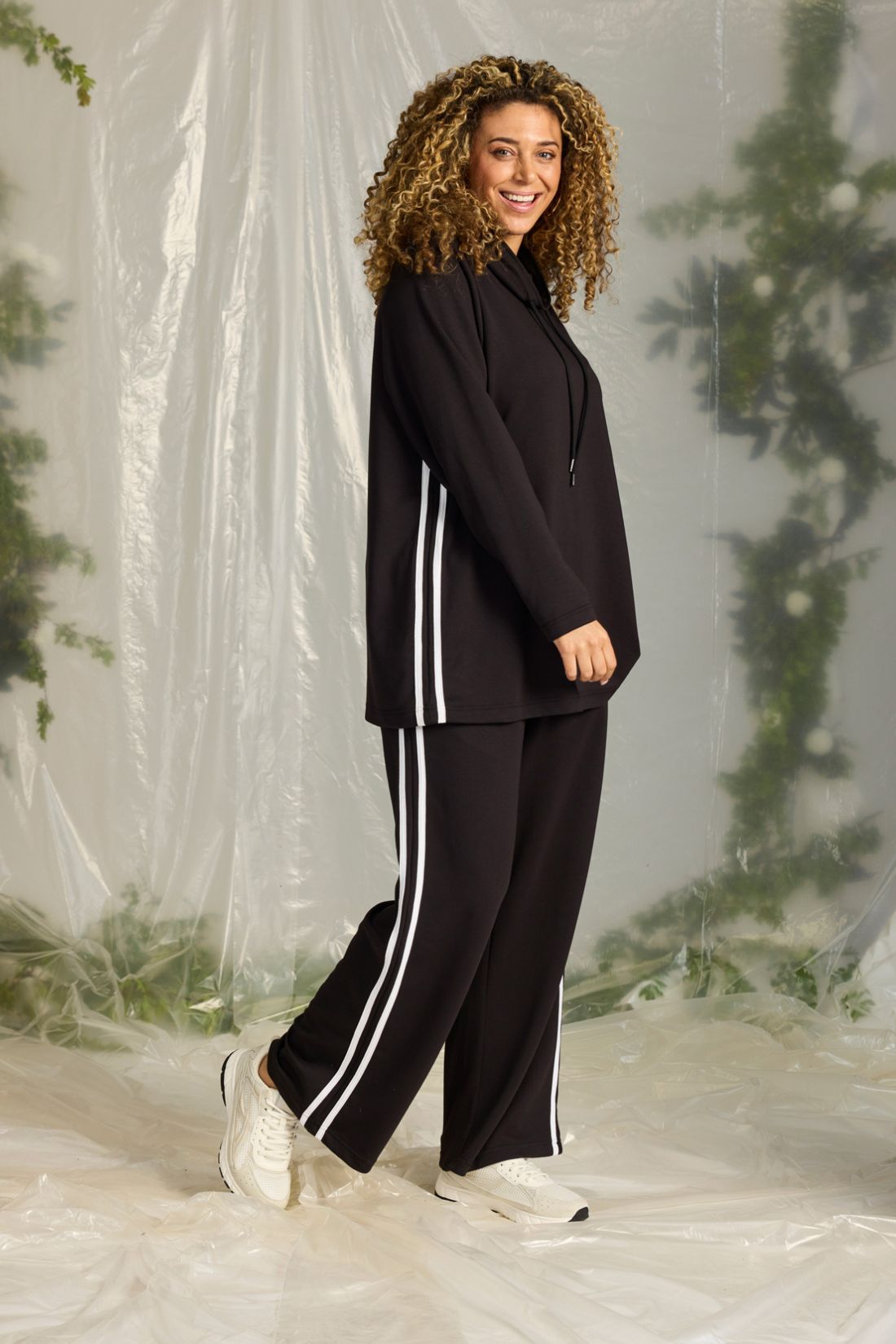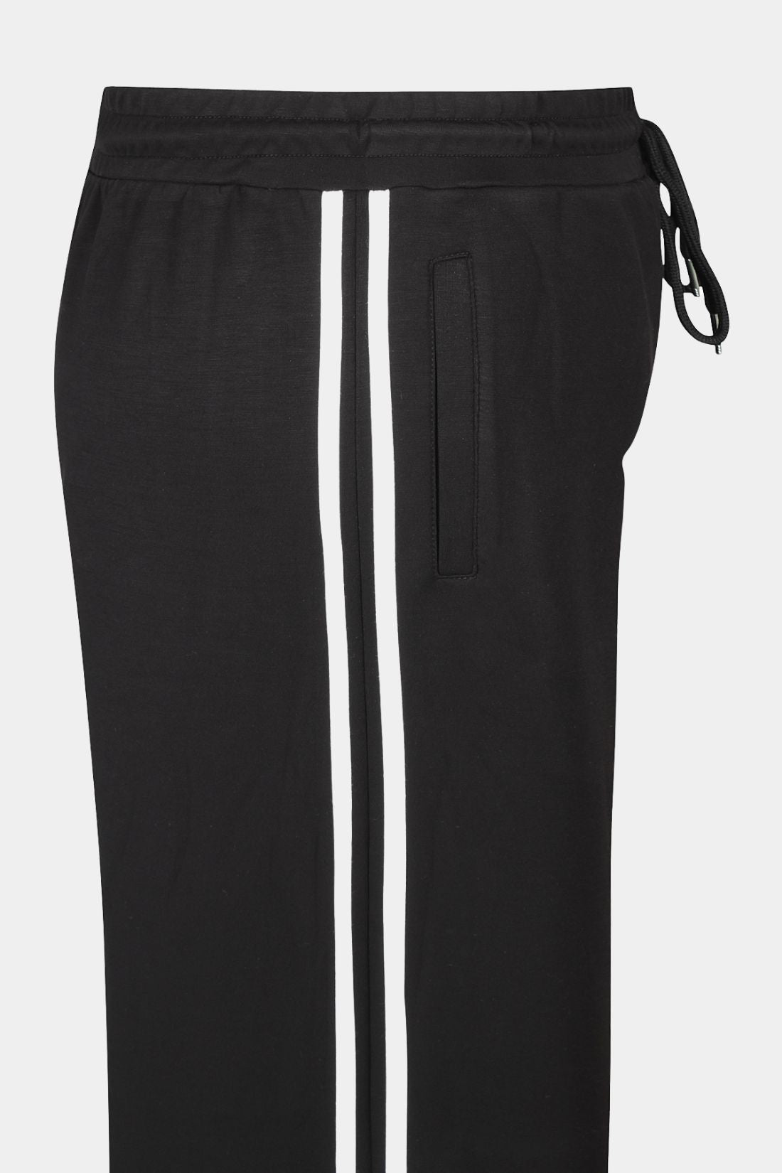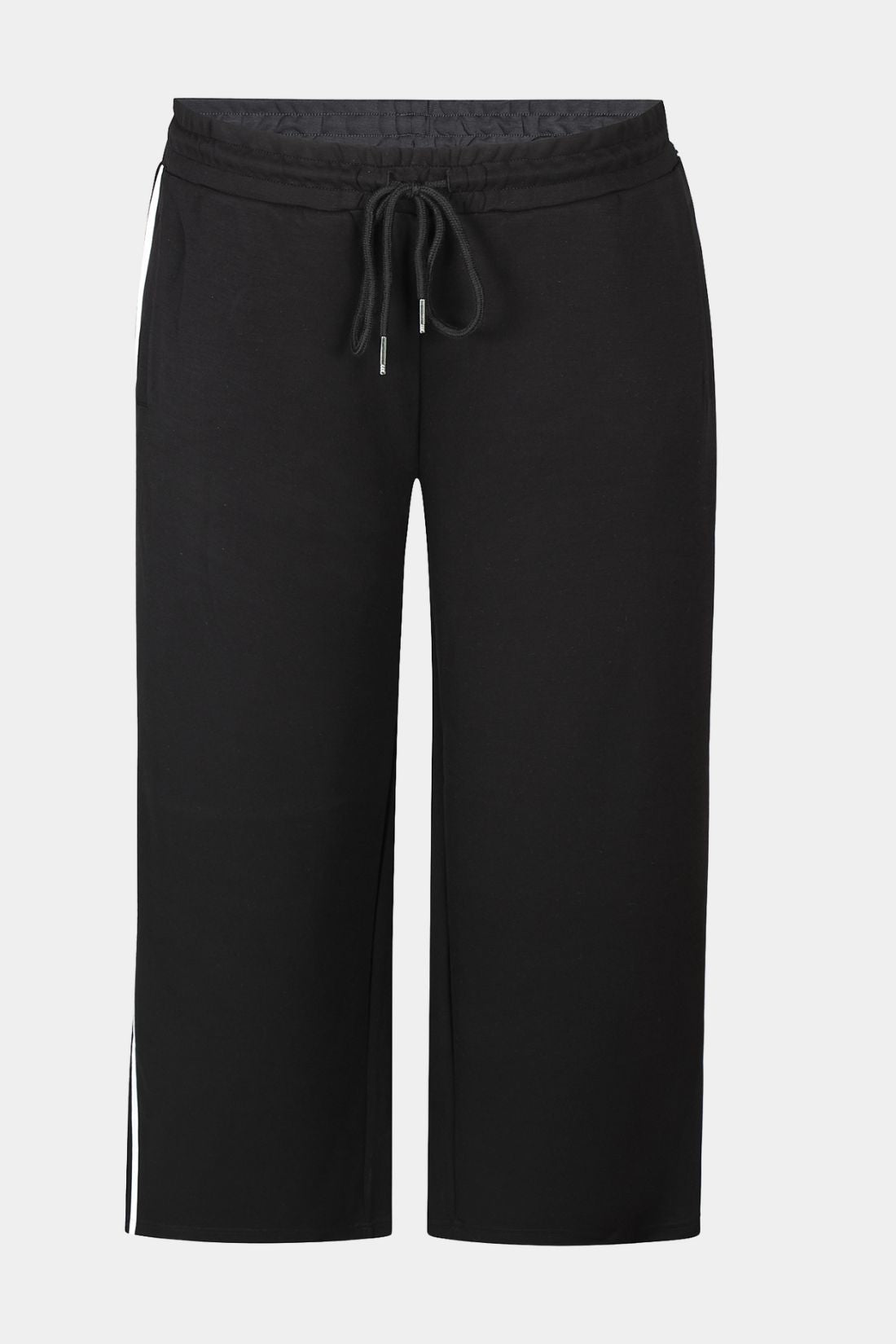 Det sorte design er kombineret med to hvide påsyninger langs siden af benene, som giver et moderne og sporty look. Vidde i benene, elastik og bindebånd i taljen samt praktiske lommer fuldender den komfortable pasform.