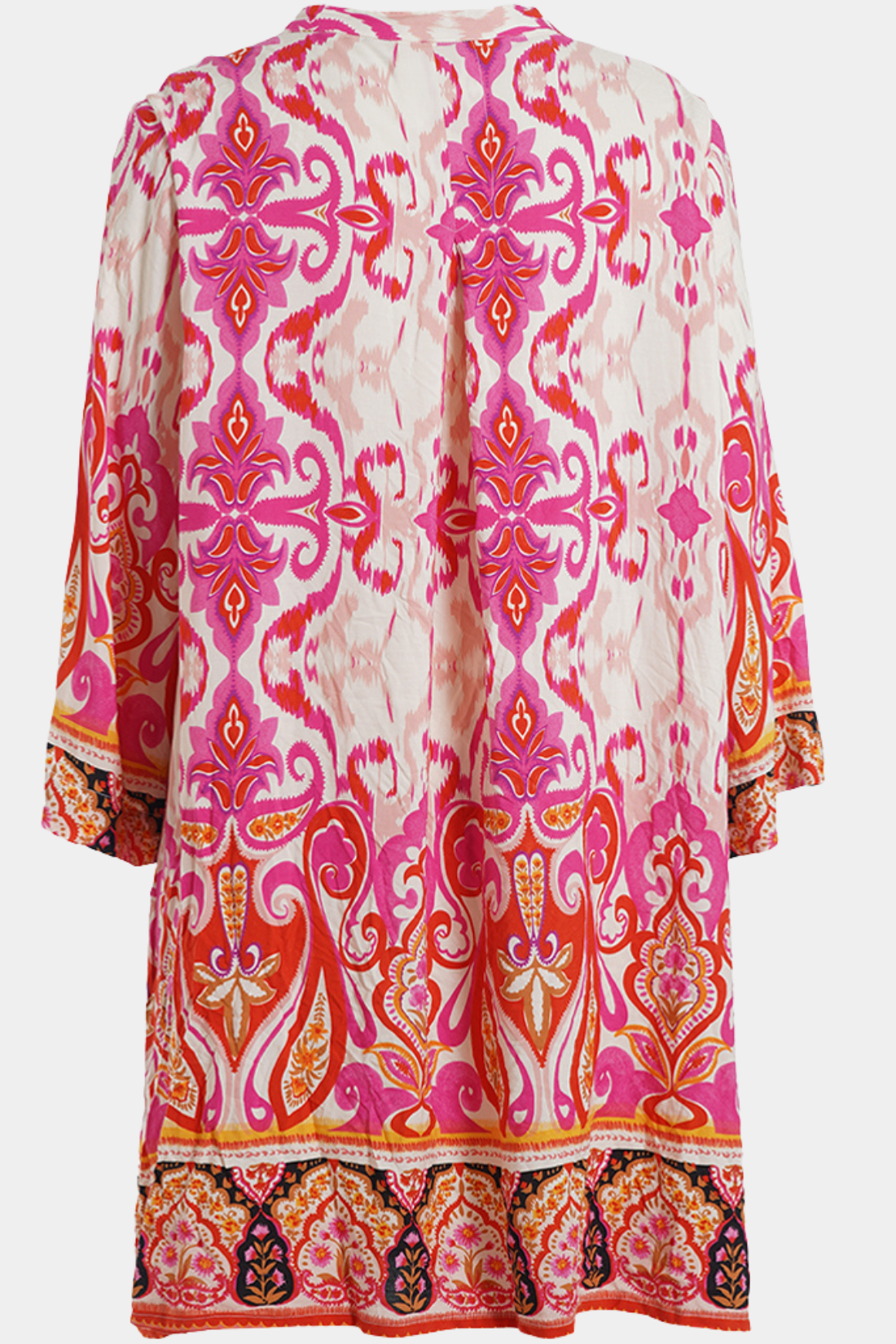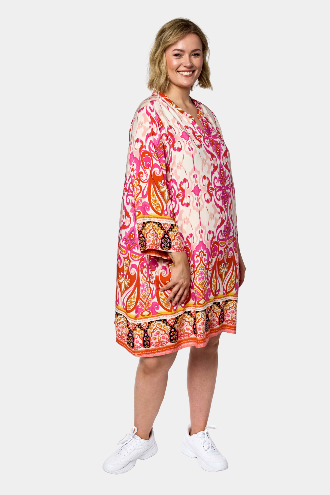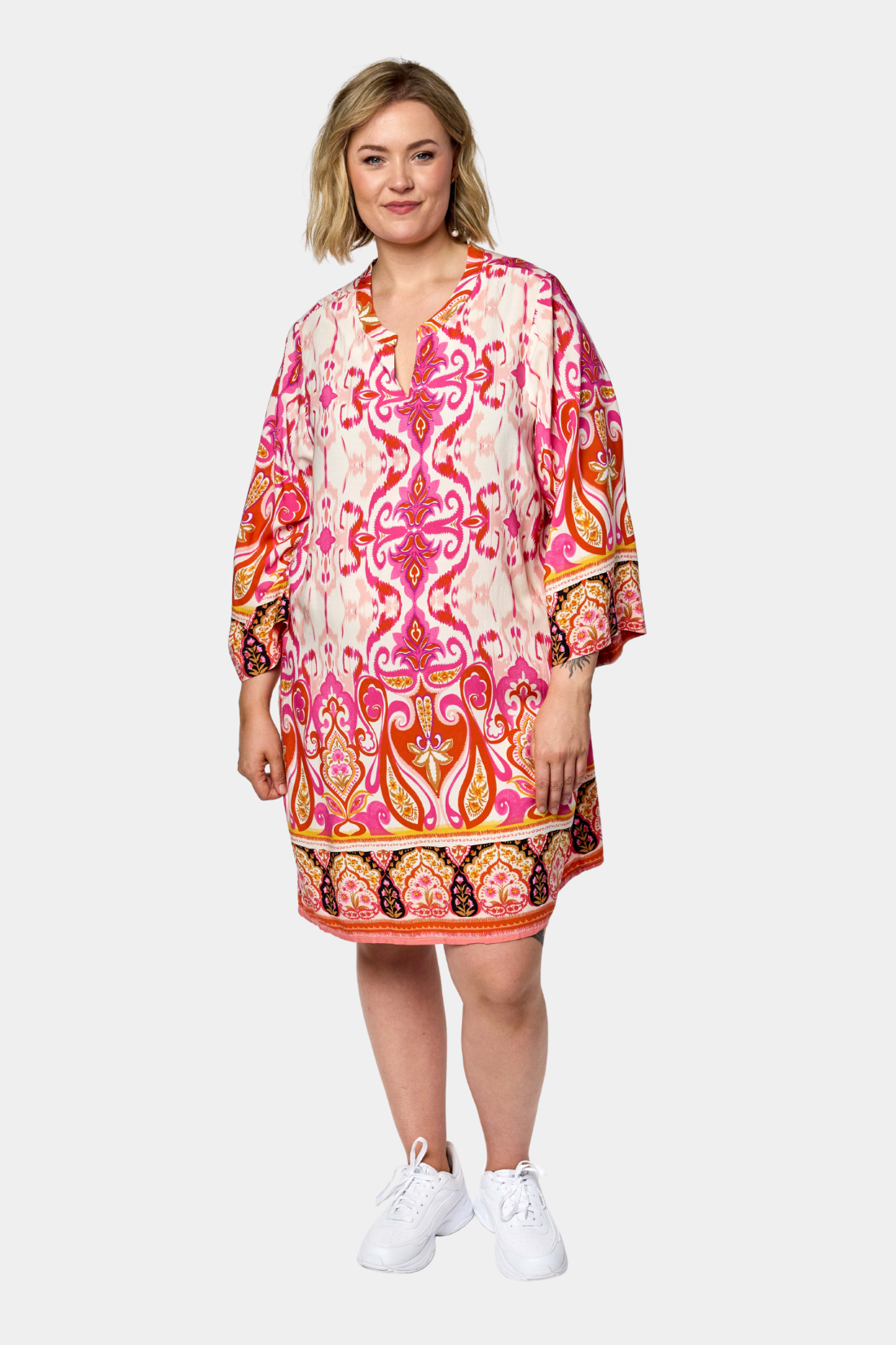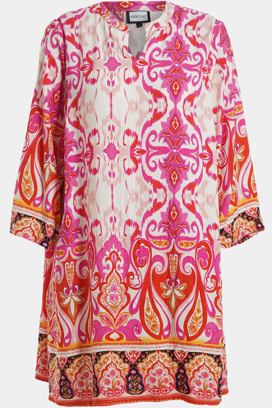 En feminin tunika fra Gozzip i ren viskose med et smukt og iøjnefaldende print i varme nuancer der giver et levende og indbydende udtryk. Den løse silhuet med god vidde sikrer et flot fald og høj komfort og gør tunikaen perfekt til både hverdagen og mere afslappede anledninger. Nem at style med leggings eller smalle bukser.